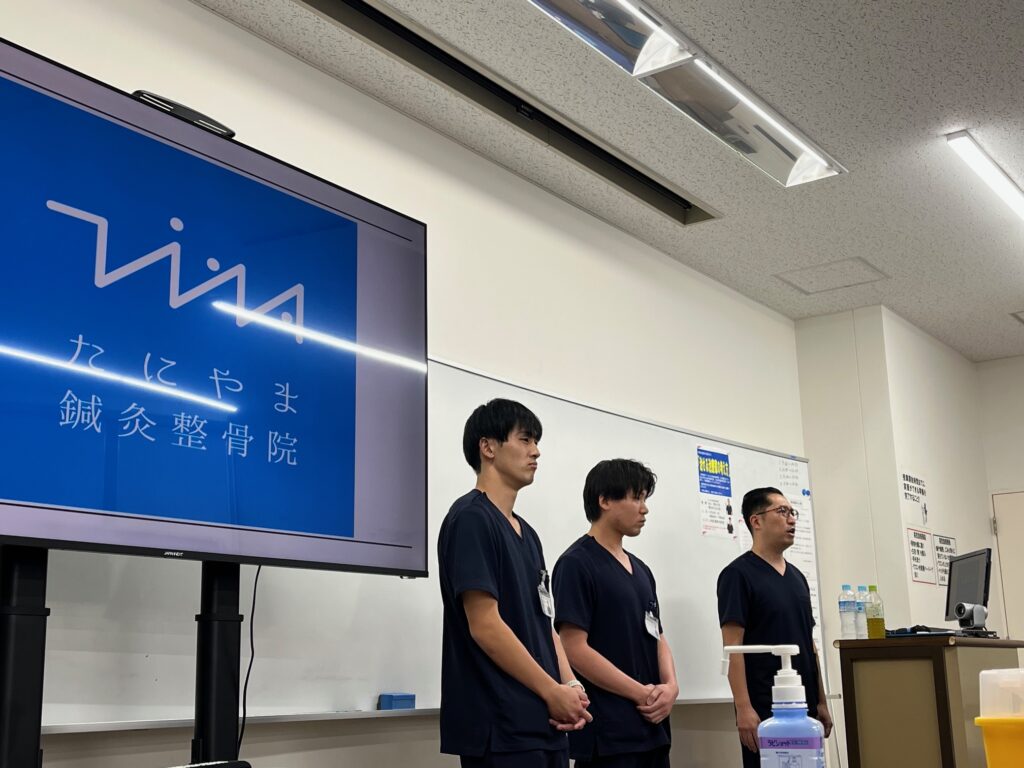 両学科では、地方創生および地域貢献ができる人材の育成を目標に教育を行っており、本講演会では、その実践例として、南丹市にて開業し、本学卒業生を多数雇用されているほか、在学生が多く参加する勉強会を継続的に開催するなど、学生との関わりも深い「たにやま鍼灸整骨院」より、橋本先生(2025年3月 本学鍼灸学科卒業)を中心に、院長の谷山先生にもご講演いただきました。